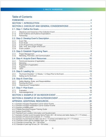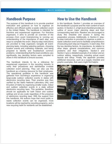 Best practices for organizing public e-waste collection events provides practical guidance for organizing effective e-waste collection events in both indoor and outdoor settings. It covers essential steps such as defining goals, developing event descriptions, establishing organizing teams, acquiring resources, and evaluating post-event outcomes. It also includes examples of event layouts, logistics, and lists of supplies for both indoor and outdoor events. The handbook draws from Sunnking's extensive experience and has been verified by Idaho National Laboratory and E Cyclers of Idaho to ensure its applicability across various scales and locations.